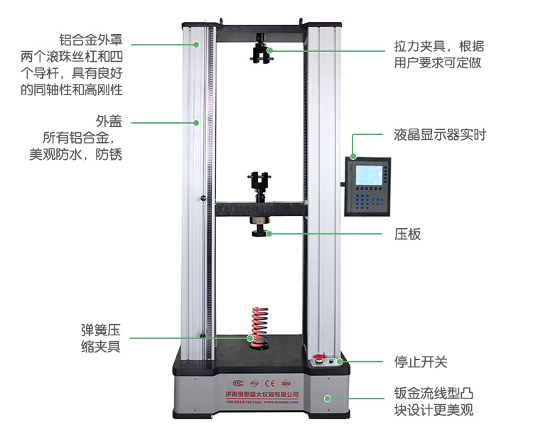 本機依據國家彈簧拉壓試驗機標準規定的技術要求制成,專業設計的自動控制和數據采集系統,實現了數據采集和控制過程的全數字化調整。能對拉簧、壓簧、碟簧、塔簧、板簧、卡簧、片彈簧、復合彈簧、氣彈簧、模具彈簧、異形彈簧等精密彈簧的拉力、壓力、位移、剛度等強度試驗和分析。